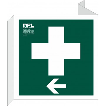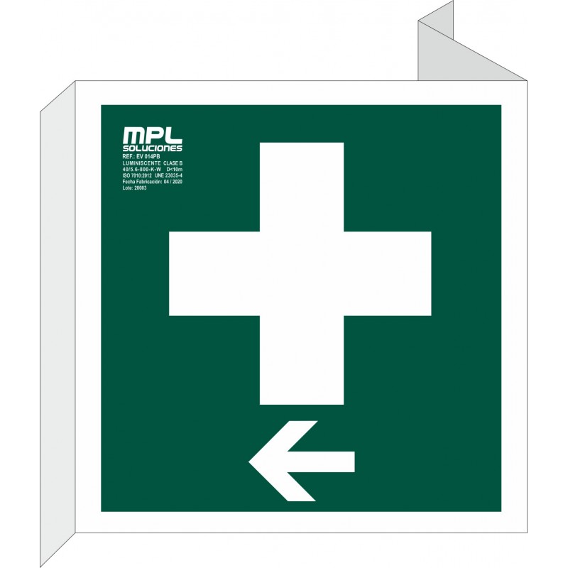 Señal direccional que apunta hacia la derecha y arriba. Se usa para guiar a las personas hacia una salida o un punto de interés que está en un nivel superior y a la derecha.