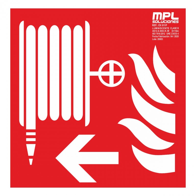 Señal que indica que el traje ignífugo se encuentra a la izquierda. Guía al personal de emergencia o de seguridad al equipo de protección contra el fuego más cercano.