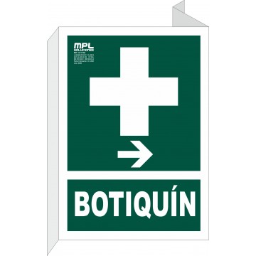 Señal que indica una estación de primeros auxilios a la derecha. Se usa para guiar a las personas a un lugar donde pueden recibir ayuda médica en caso de emergencia.