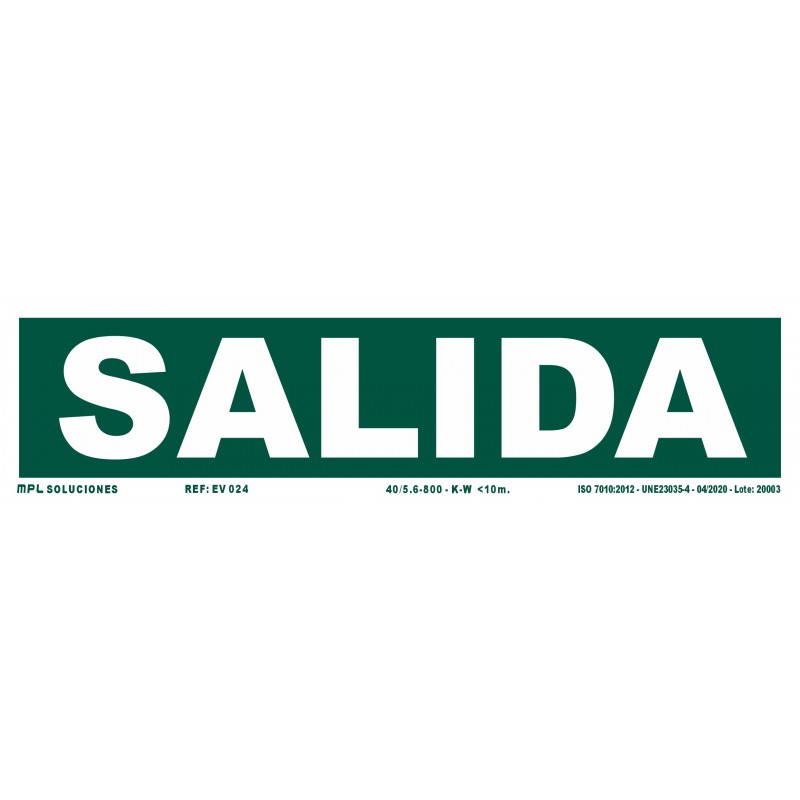 Señal estrecha que indica una salida en inglés. Es ideal para pasillos o áreas con espacio limitado, garantizando que el mensaje sea claro para los visitantes internacionales.