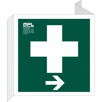 Señal direccional que apunta hacia la izquierda y arriba. Sirve para dirigir a las personas hacia una salida o un punto de interés que se encuentra en un nivel superior y a la izquierda.