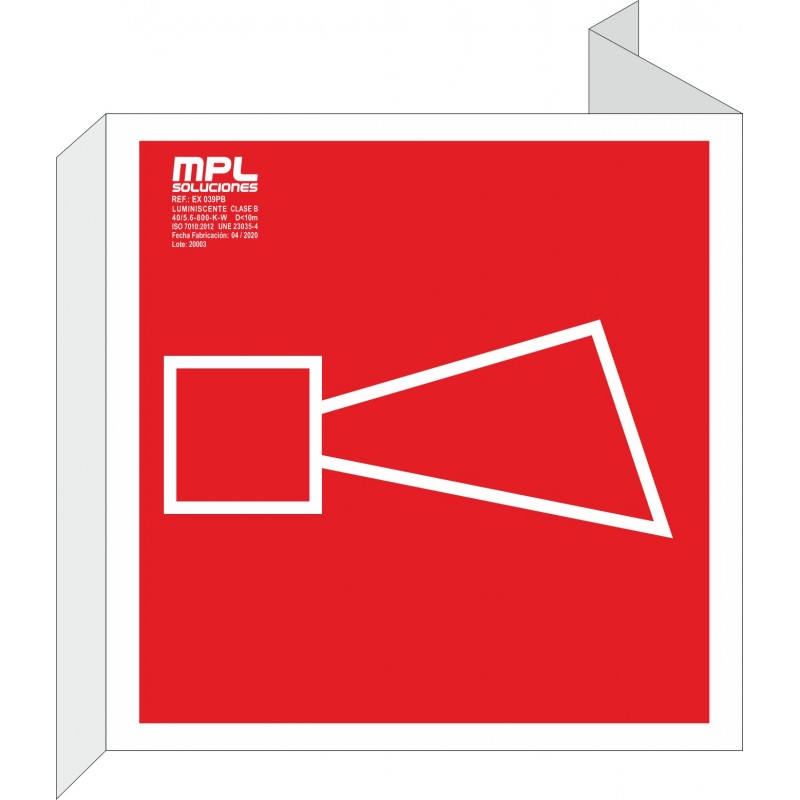 Señal que indica una escalera de emergencia a la derecha. Es vital para guiar a las personas por las escaleras de emergencia en una evacuación, asegurando una salida segura y ordenada.
