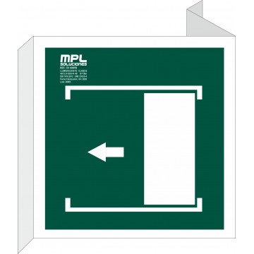Señal que indica que la clínica se encuentra a la izquierda. Se usa en grandes complejos industriales o campus universitarios para dirigir a las personas a un centro médico de atención primaria.