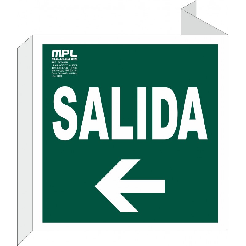 Señal que indica una salida de emergencia a la derecha. Es esencial para guiar a las personas de manera rápida y segura hacia un punto de evacuación en caso de incendio o cualquier otra emergencia.