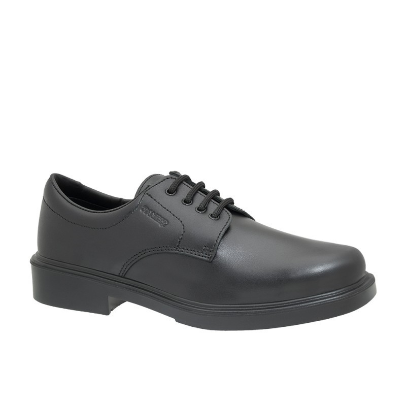 Calzado laboral para hombre en color negro y piel 1ª flor natural hidrófuga, escogida por su calidad, resistencia y capacidad transpirable. Zapato antifatiga, para profesionales que pasan mucho tiempo de pie. Calzado profesional tipo ejecutivo, formal, urbano, oficina, uniforme...